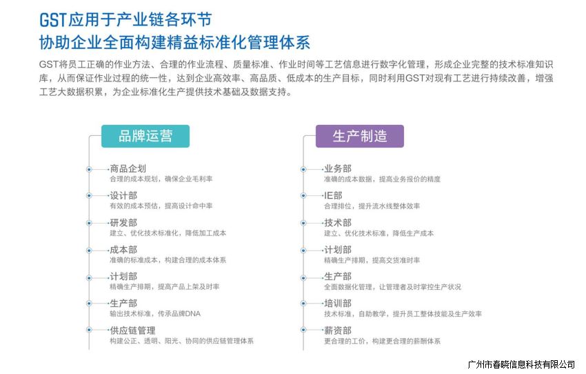 星空电竞GST采用行业通用的动作标准,可对缝制品行业的裁床、车缝、手工、烫、检验、包装等生产环节进行动作分析及时间研究,形成企业管理所需的技术标准和工时标准。为企业推行精益标准化生产提供数据及工具。通过GST动作代码,可以准确描述每一个员工每天的所有作业过程,来帮助员工建立标准作业方法,同时提供准确的作业时间。通过标准工时对员工进行效率评估及合理分工,让产线最大限度达到平衡状态,减少效率损失; GST帮助企业建立工艺数据库,建立全面的知识管理,助力企业数据化,标准化,科学化管理,让应用成本下降,构建时代万恒精益标准化管理体系,打造有竞争力的纺织服装生态链。