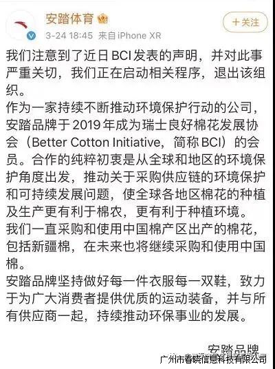 刚刚,安踏官方微博@安踏体育发表声明称,注意到了近日BCI发表的声明,并对此事严重关切,星空电竞正在启动相关程序,退出该组织。声明还称,安踏一直采购和使用中国棉产区出产的棉花,包括新疆棉,在未来也将继续采购和使用中国棉。